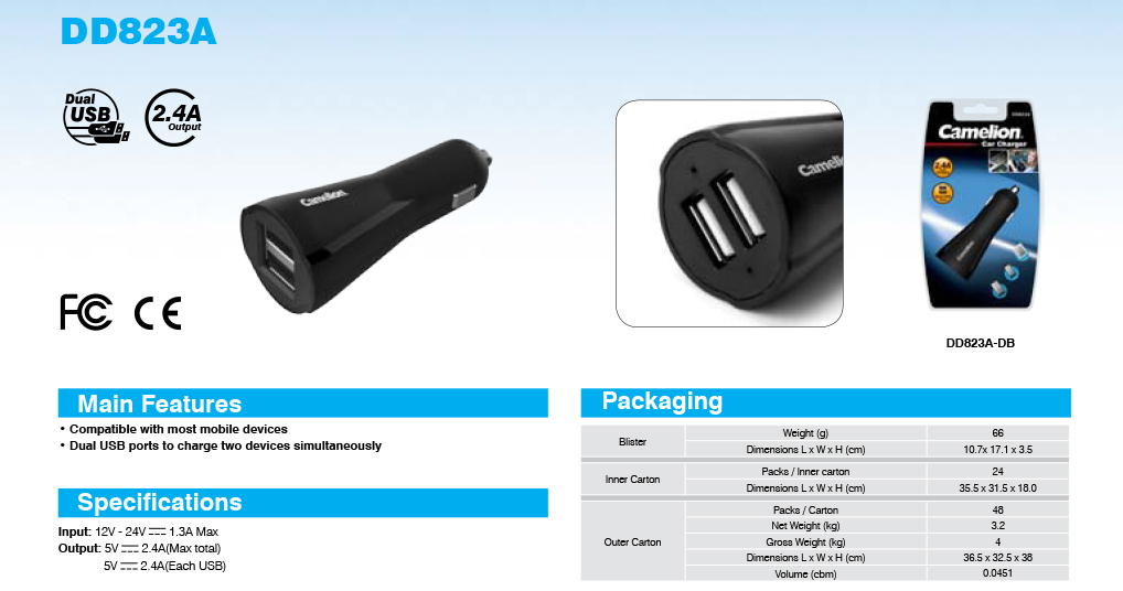 这款飞狮USB车载充电器采用12-24V直流输入电压,输出5V DC 1A + 1A,适用于所有Apple产品,如iPad,iPhone和iPod等数码产品和智能手机