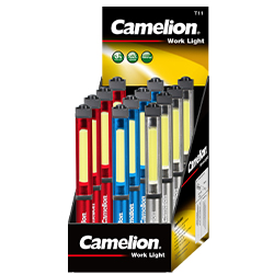 This Camelion pen shape Work Light T11 provides a powerful lighting with a 3W COB LED and is powered by 3 AAA size batteries. It is made of CNC machined anodized aluminum alloy and has a plastic rotating magnetic clip on the product. It can be convenient put in pocket or attach to any metallic surface for convenient lighting. |