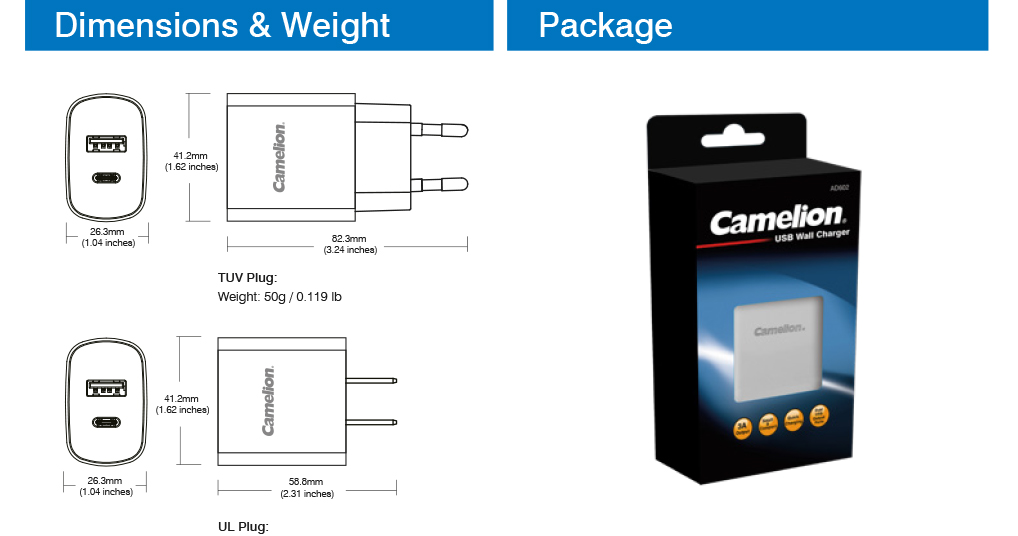 The Camelion AD602 USB Wall Charger has 2 output ports. The USB-C port supports PD fast charge protocol. USB-A enables QC fast charging. This charger is suitable for most portable devices. It keeps your devices powered at home, in the office or during the travel. |