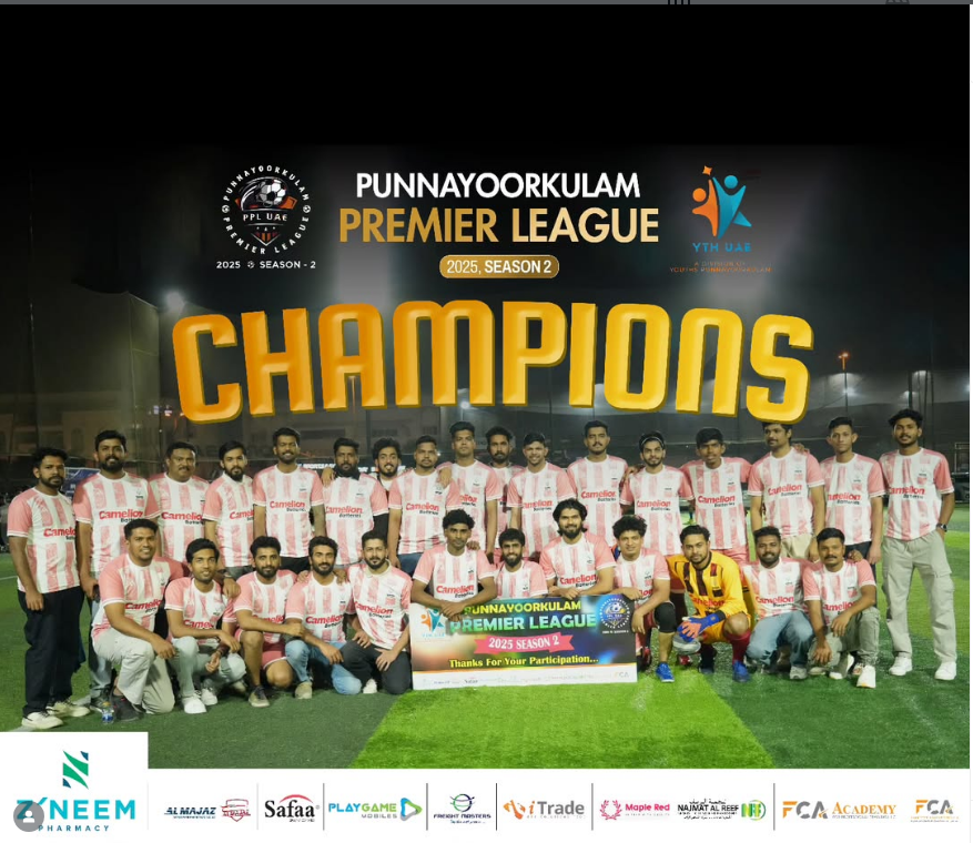 In an electrifying finale under the floodlights, the Camelion-sponsored football team --- Team Warriors Punnukkav, lift the trophy at Punnayoorkulam Premier League Season 2.0, proudly organized by YTH UAE "A Division of Youths Punnayoorkulam"