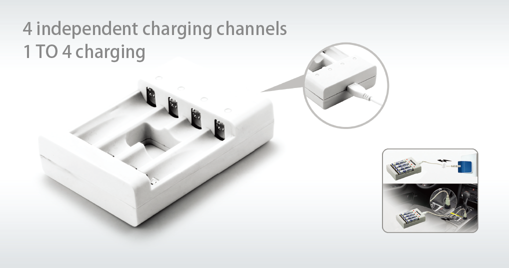 BC-0807S USB Battery Charger is designed to charge 1 to 4 pcs Ni-Mh/Ni-Cd AA/AAA rechargeable batteries. The 4 independent charging channels are allowed to charge respectively or with optional combinnation of AA and AAA batteries.
