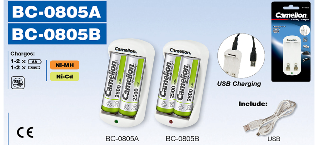 BC-0805A ● Charges 1 or 2 pcs Ni-MH or Ni-Cd AA/AAA batteries ● Reverse Polarity Protection ● Safety Timer Control (12 hours) ● -△V Cut Off The high sensitivity electronic circuit stops