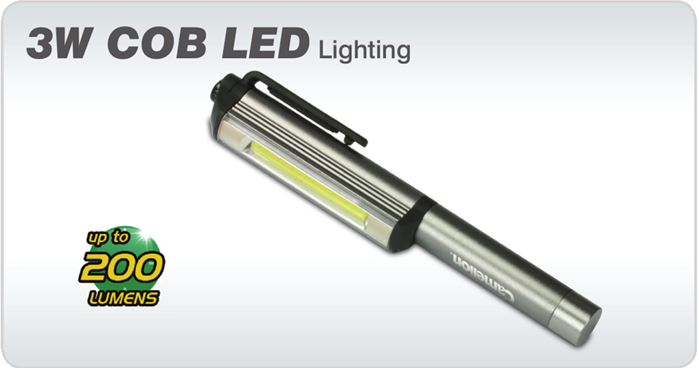 This Camelion pen shape Work Light T11 provides a powerful lighting with a 3W COB LED and is powered by 3 AAA size batteries. It is made of CNC machined anodized aluminum alloy and has a plastic rotating magnetic clip on the product. It can be convenient put in pocket or attach to any metallic surface for convenient lighting. |