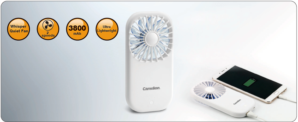 This 2-in-1 mobile power with Fan is not only an ultra lightweight charger - it's also a portable fan. The easy-to-use button located at the front of the unit allows you to effortlessly switch between the built-in fan’s two speeds. It delivers a steady breeze that keeps you cool while your device is charging. A battery capacity of 3800mAh helps you get the most out of your devices by providing a safe and reliable charge when you're on the go. These features, coupled with a comfortable ergonomic design, make the 2-in-1 Portable Charger with Fan a must have for the home, office, dorm, while traveling or for
