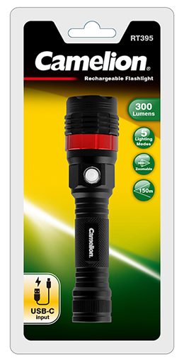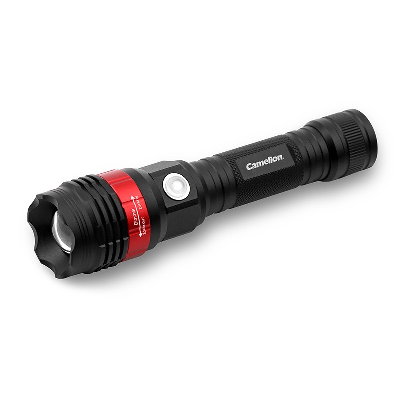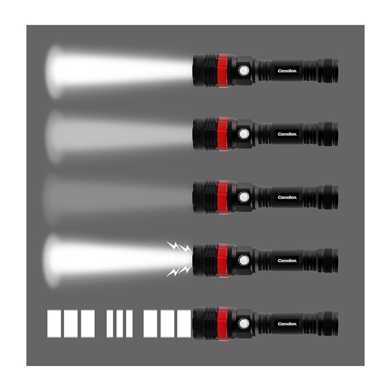 The Camelion RT395 rechargeable flashlight has an aircraft aluminum body with anodized surface. Its T6 LED provides an ultra bright light beam. This flashlight has 5 lighting modes and allows the user to adjust the focus by easily turning the ring. Powered by a lithium-ion battery, this item is ideal for outdoor activities and security.