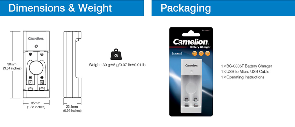 The Camelion BC-0806T battery charger has multiple levels of safety protection to help prolonging the battery life. One-channel charging system designed to recharge two Ni-MH / Ni-Cd AA or AAA batteries simultaneously. It has an 8-hour safety timer control and green LED charging status indicator. The micro USB input port allows it to be used with any DC 5V/1A adaptor. This compact battery charger is ideal for use at home and on the go.