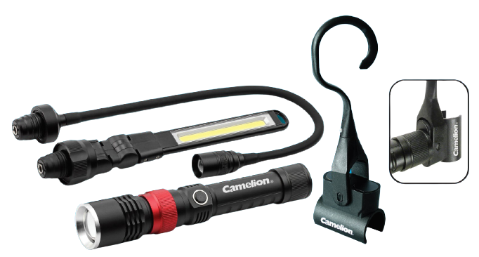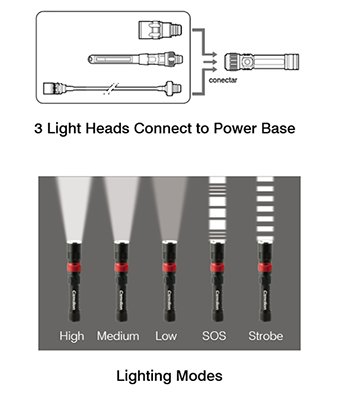 ● 3 Quick-connect inter-changeable light heads: Flashlight, Work light and Flexible light