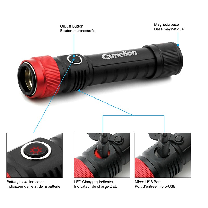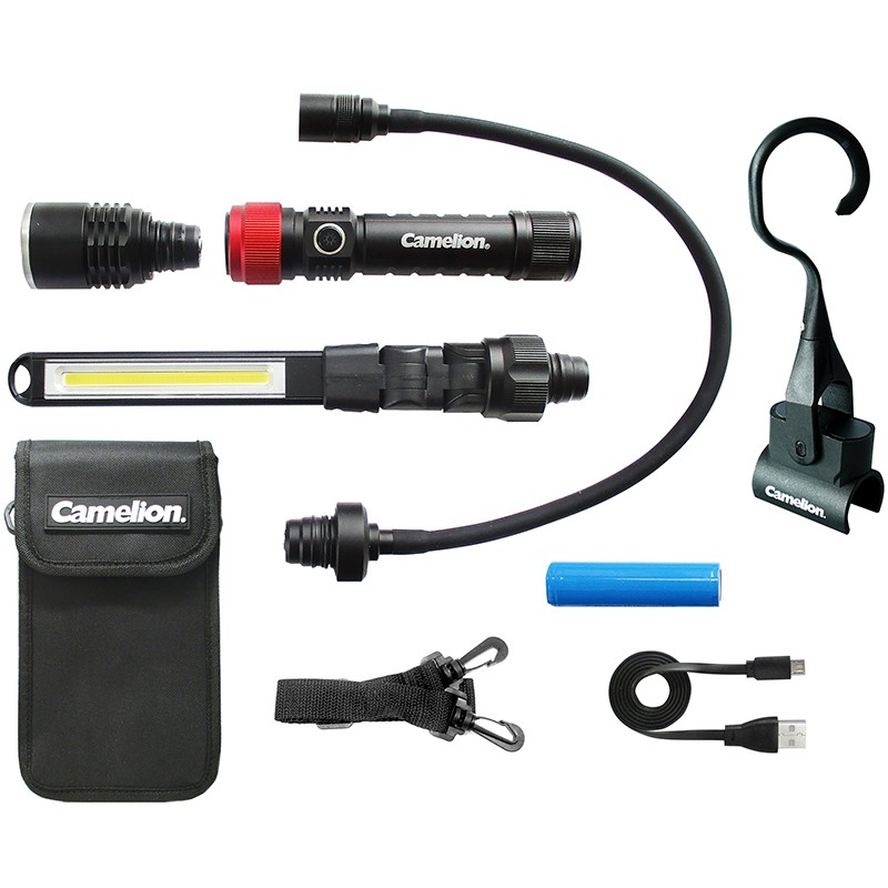 ● Flashlight and Flexible Light heads offer adjustable beam focus ● Rechargeable power base with micro-USB port and Integrated magnetic base for hands free operation. ● Battery status Indicator light ● Efficient 2600mAh rechargeable Li-ion battery ● Durable and lightweight aircraft grade aluminum construction. ● Includes storage carrying pouch, Micro USB to Type A USB Cable (24 inches), magnetic hook & holder