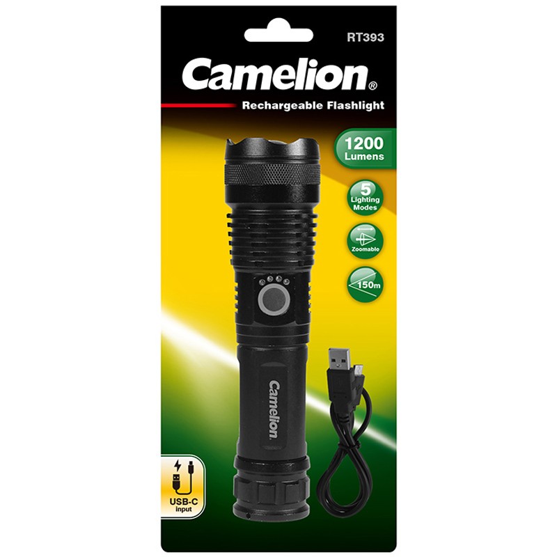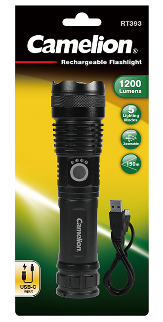 The Camelion RT393 Rechargeable Flashlight combines today's technology and dependable performance. This flashlight features five lighting modes with an adjustable beam focus head.The high lumen output and ultra long beam distance create brighter beam coverage and a wider visibility range than your standard flashlight. With its durable tactical construction, you can count on it in extreme conditions indoors and outdoors.