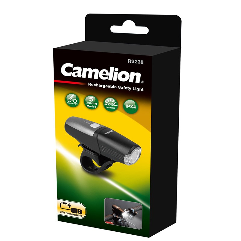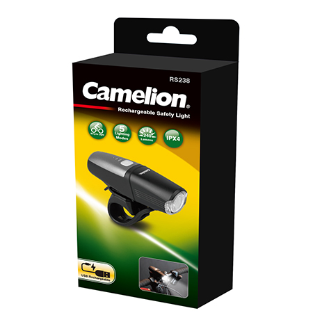 The Camelion RS238 rechargeable bicycle front light is constructed with high-quality LEDs. Offering 240 lm super bright illumination and multiple lighting modes, it maximizes your vision to the on-coming traffic while revealing an alerting light that warns the cross traffic to your presence. Structured with a 360° rotatable strap holder for any horizontal-direction illumination, detachable light head with a lock slot, easy and fast installation with a simple buckling-up, it offers extreme flexibility and durability to keep you safe on the road during any night ride.