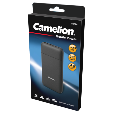 Camelion PS726 Mobile Power, with a high-performance cell of 10,000mAh capacity, is designed to provide a powerful simultaneous 2-device charging. With multi-level safety protections, it is ideal to keep your phones, tablets and other mobile devices powered at any time, anywhere.