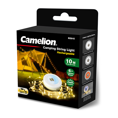 Camelion 2-in-1 Rechargeable Camping and String Light - RS915 is uniquely designed to combine camping light and string lights in one versatile light. With a powerful camping illumination of up to 400 lumens, it features a 10-meter retractable LED string light that can be easily pulled out with a tape hook and quickly rolled back in with a mini-crank, ensuring tangle-free organization. The RS915 offers flexibility with 2 independent switches and 6 basic lighting modes, allowing lighting customization to suit your specific needs. The ultra-compact design ensures easy carrying, hanging, and storage,making it the