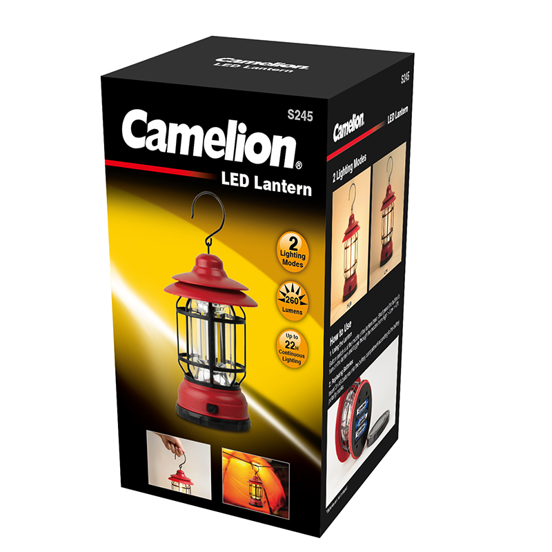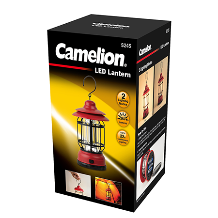 Camelion S245 LED Lantern comes with classic design. It provides 360° illumination and 2 lighting modes to create atmospheric ambiance in various scenarios. Elegant and convenient handle ensures easy carrying or hanging. It is a great addition for the outdoor activities such as camping or entertaining in the backyard.