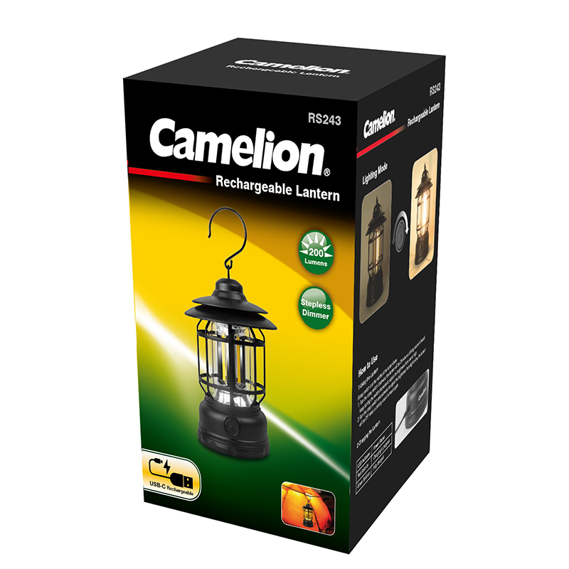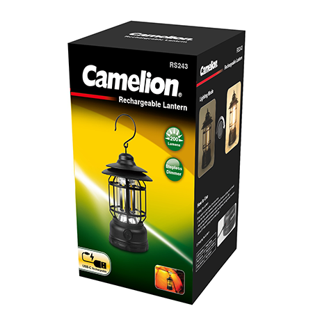 Camelion Rechargeable LED Lantern RS243 comes with classic design. It provides 360° illumination and stepless dimming function to create atmospheric ambiance in various scenarios. Elegant and convenient handle ensures easy carrying or hanging. It is a great addition for camping or entertaining in the backyard and beyond.