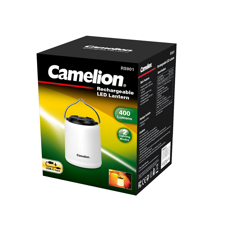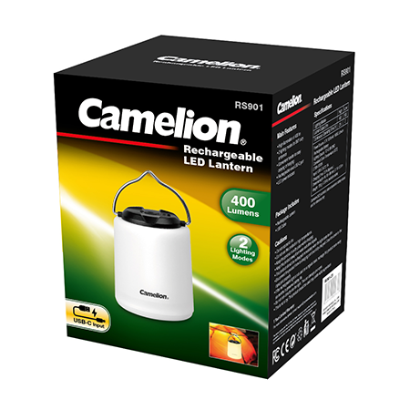 Camelion Rechargeable LED Lantern RS901 comes with sleek design. It illuminates your surroundings with 400 lumens of 360° cozy light, perfect for creating an atmospheric ambiance in any scenarios. The elegant and convenient handle ensures easy carrying or hanging, making it a great addition for camping or entertaining in the backyard and beyond.