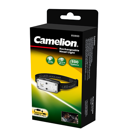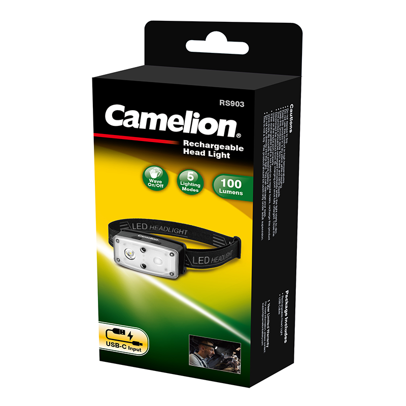 Camelion RT903 Rechargeable Head Light is engineered with cutting-edge technology. Equipped with dual lighting switches, the RS903 boasts a traditional manual control and an auto-sensor activation feature for touch-less experience, which means it can respond effortlessly to your waving hands within a 10cm range. With 5 versatile lighting modes, this headlight ensures you have the perfect brightness for any situation. Crafted with user comfort in mind, the RS903 features a 90° adjustable light angle, allowing you to direct the beam precisely where you need it. You can always count on this unit for excellent lighting experience whenever you go for a camping, fishing, hiking and more.