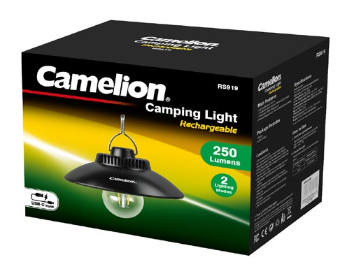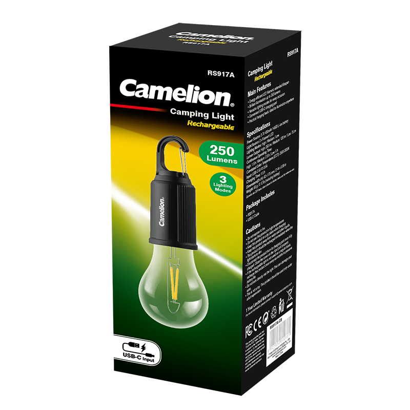 Camelion Rechargeable Camping Light - RS917A combines energy efficiency with powerful performance. With 3 lighting modes, you can easily adjust the brightness to suit your needs. The built-in USB-C charging port ensures quick and hassle-free recharging, while the practical hanging hook allows you to illuminate any space with ease. Whether you're at home, outdoors, or on the go, the RS917A is designed to light your way. |